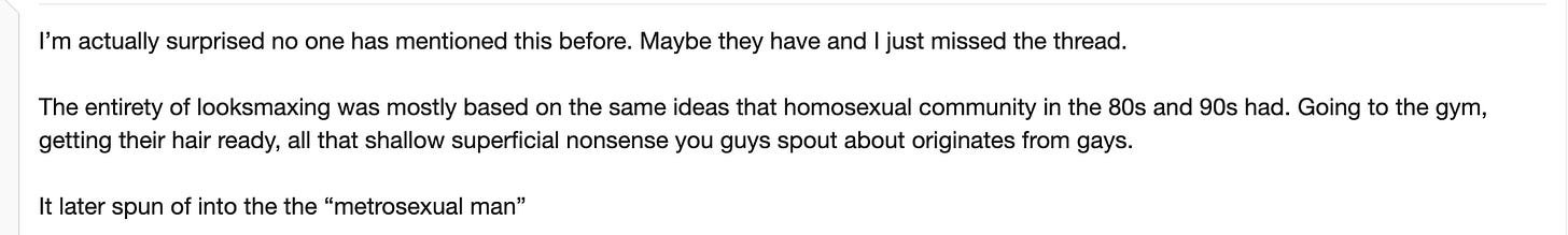 Looksmaxxing feels like rebranded gay culture, and the community itself will tell you as much. A Looksmax.org thread titled “looksmaxing is gay” argued the entire movement descended from gay culture in the ‘80s and ‘90s, and that even Tinder was a spinoff of gay dating apps (which is obviously true, I remember when my gay friends had Grindr and all I had OkCupid). Both communities landed on the same toolkit independently: meth, SARMs, grey-market peptides, anabolic steroids.