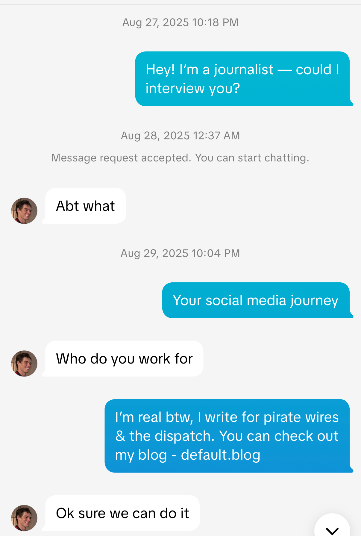 Anyway, naturally, I’ve been kicking myself every single day for fumbling an interview with Clavicular — well before he blew up. He was willing to talk! We took it to email! And then I was the flake, he got huge, and now, I, too, am just a random jester trying to clout vampire him. Trust your gut, folks, or you may live to regret it.