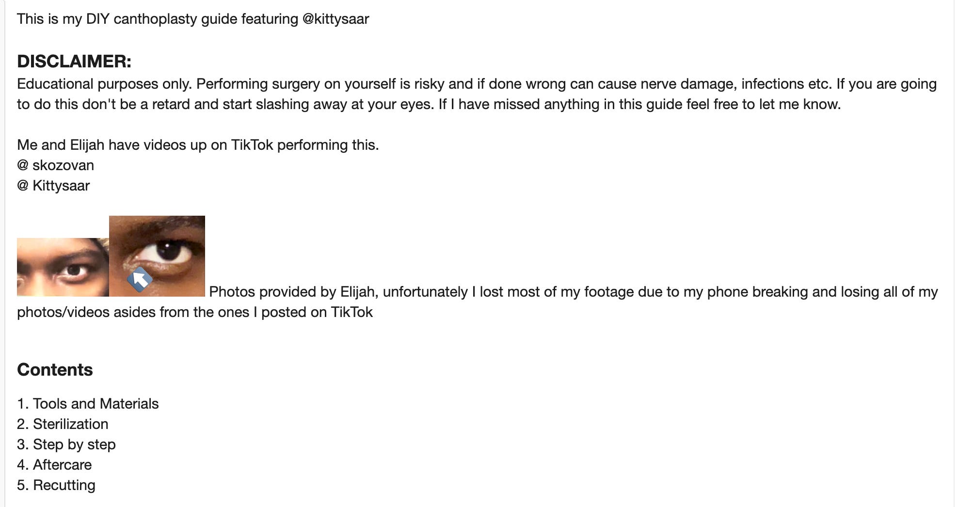 On looksmaxxing forums, the horror is more methodical, though. It’s not that injecting tire sealant into your ass isn’t grotesque, but the attention to detail from looksmaxxers somehow increases the body horror quotient. Take this detailed guide for DIY canthoplasty, self-performed eye surgery using a snapped razor blade: